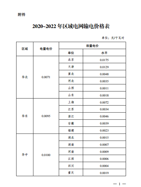 一、华北、华东、华中、东北、西北区域电网第二监管周期(2020年1月1日~2022年12月31日)两部制输电价格水平详见附件。其中,电量电价随区域电网实际交易结算电量收取;容量电价随各省级电网终端销售电量(含市场化交易电量)收取;京津唐电网范围内,位于北京、天津、河北境内的电厂参与京津唐地区交易电量不纳入华北电网电量电费计收范围。